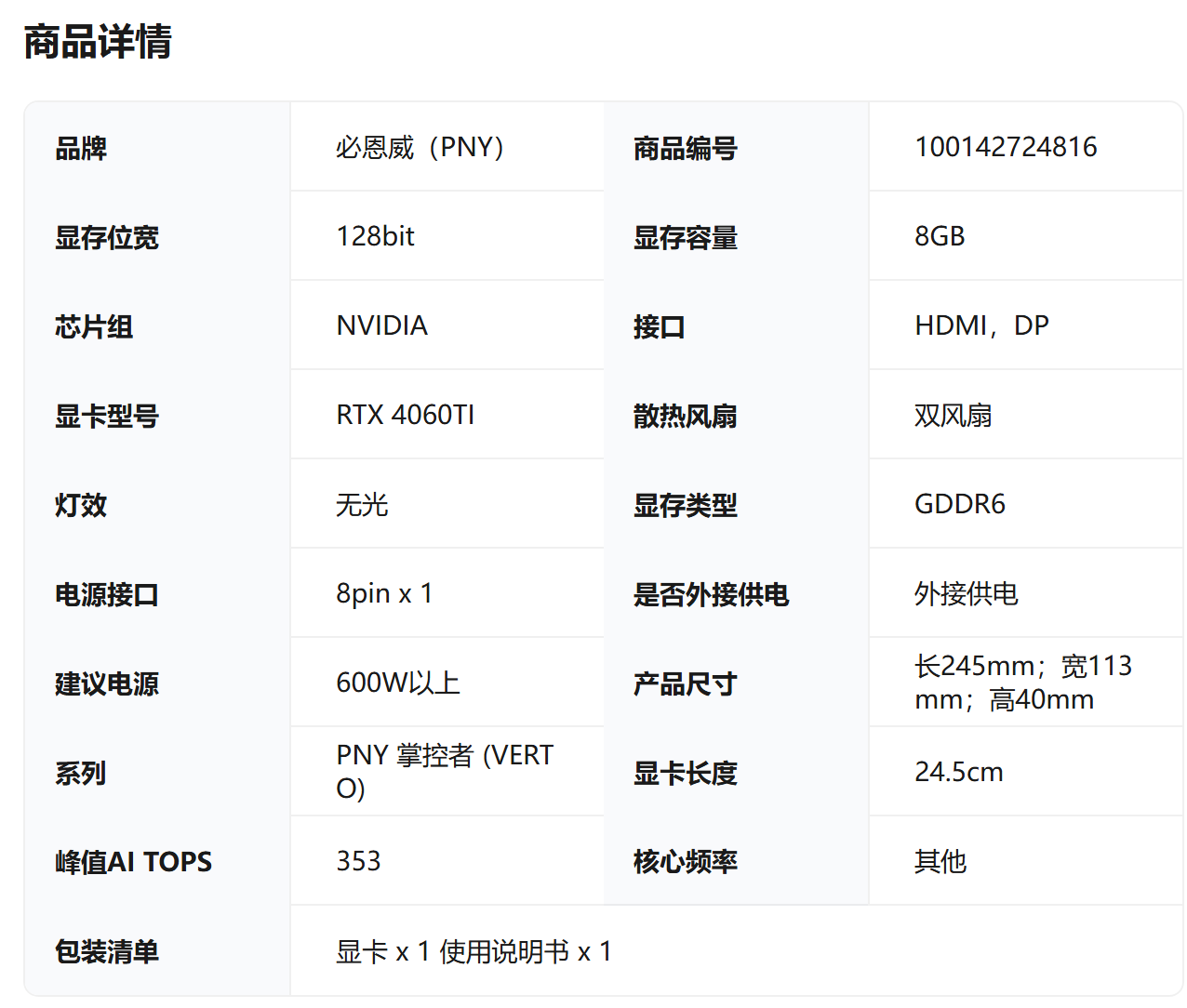 必恩威(PNY)GeForce RTX 4060Ti 8GB