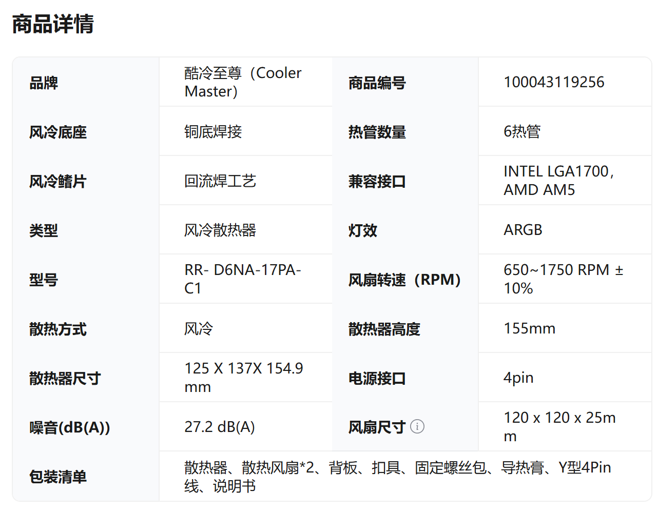 长城原装祥龙600 CPU散热器风冷6铜管单塔式静音RGB风10-29