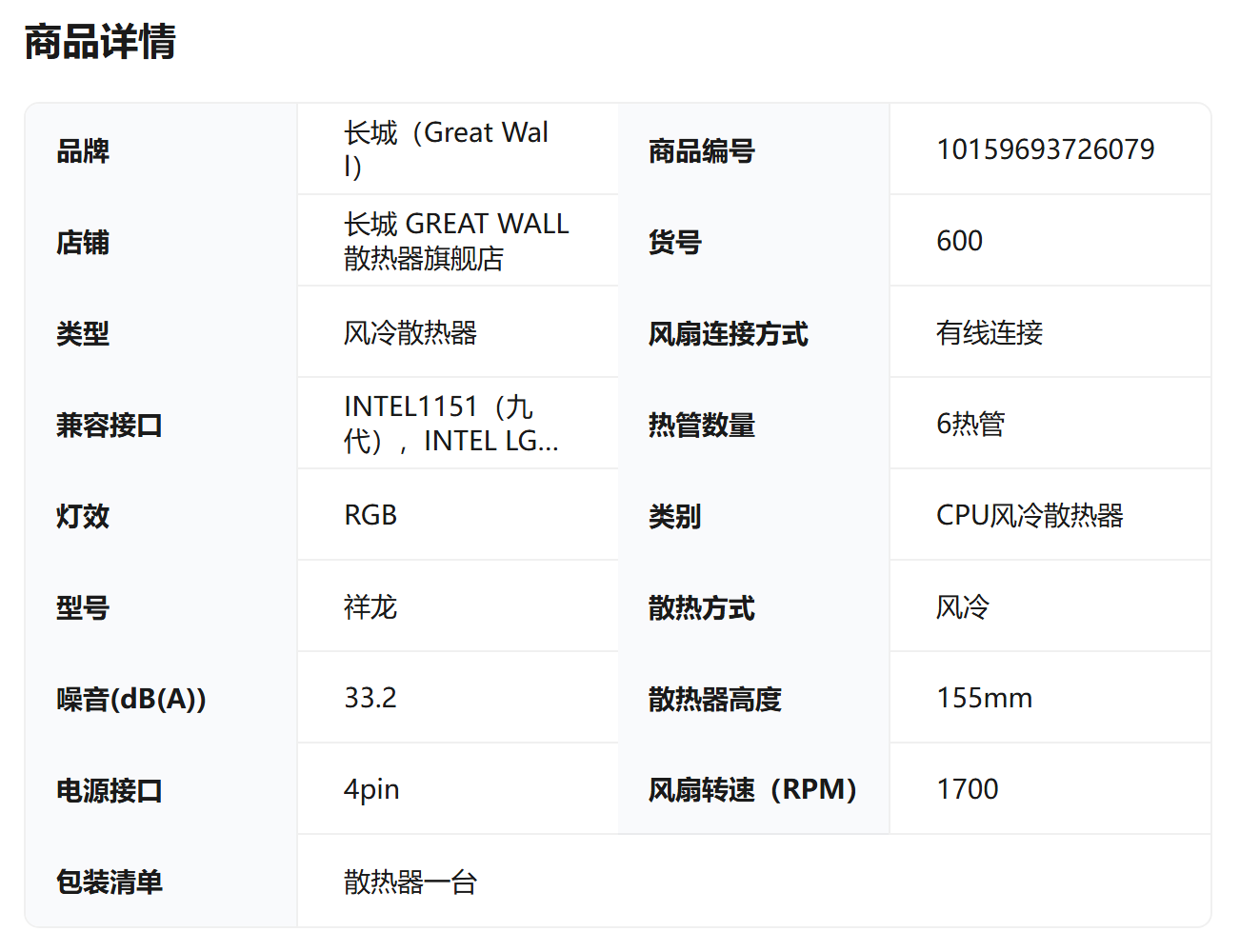 长城原装祥龙600 CPU散热器风冷6铜管单塔式静音RGB风