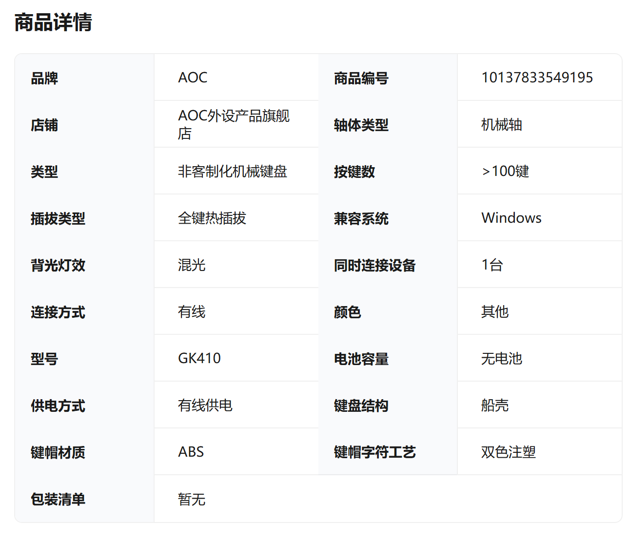 AOC GK410 有线机械键盘鼠标耳机套装 热插拔104键10-29